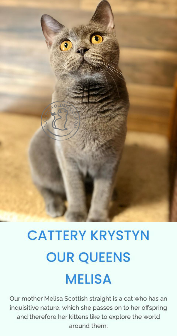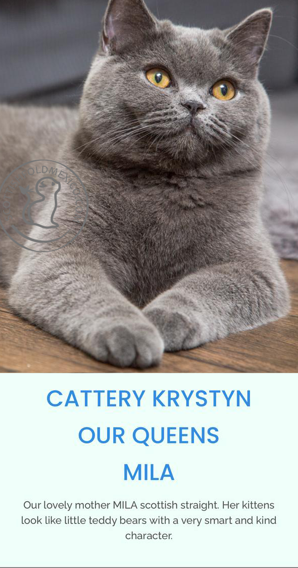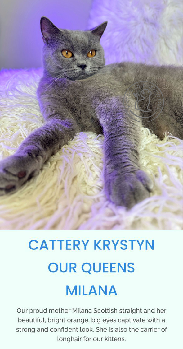 Our proud mother Milana Scottish straight and her beautiful, bright orange, big eyes captivate with a strong and confident look. She is also the carrier of longhair for our kittens.